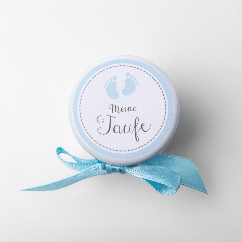 Idéal comme cadeau de baptême élégant : petits pots avec couvercle et noeud en satin. Sur le couvercle il y a un autocollant avec les pieds de bébé en bleu. Le cadeau pour invités est livré avec 5 dragées de mariage.