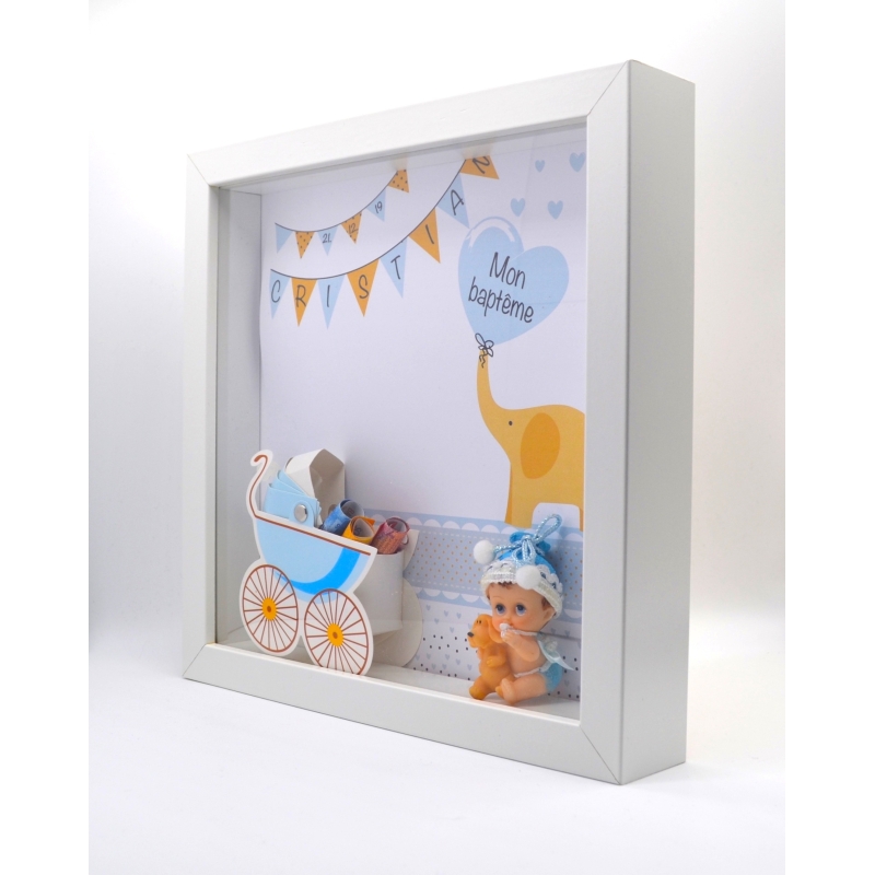 Imprimer sur du papier solide avec le nom et la date. Décorée avec un petit bébé (polyresin) et un landau (carton).