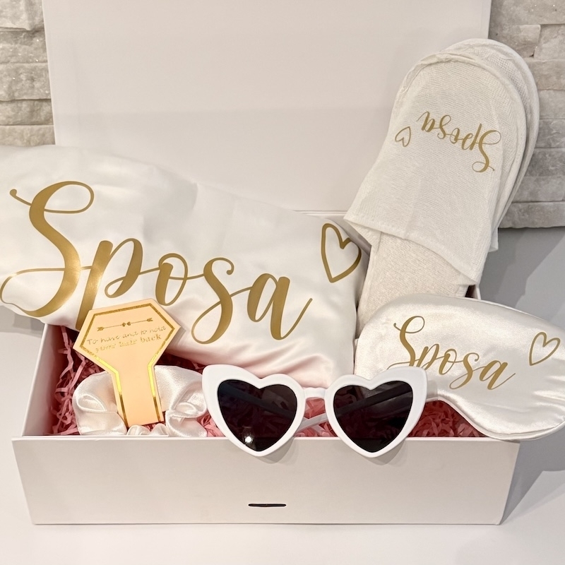Ce coffret cadeau haut de gamme est une excellente idée de cadeau pour la future mariée et contient de nombreux articles qui feront battre le cœur de la mariée. Chaque coffret est soigneusement composé et tous les produits (à l'exception des lunettes et de l'élastique à cheveux) sont décorés en doré avec « Sposa et cœur ».