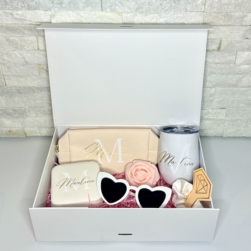 La boîte cadeau contient des accessoires soigneusement sélectionnés, notamment une trousse de maquillage personnalisée, une tasse avec un nom, un petit étui, une rose décorative, des lunettes de soleil et des éléments décoratifs élégants. Tous les articles personnalisés sont ornés d'un nom et d'une initiale en lettres dorées raffinées, ce qui rend la boîteunique et personnel.