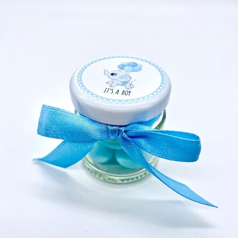Sur le couvercle, il y a un autocollant représentant un bébé éléphant avec des ballons portant l'inscription "It's a Boy". Le cadeau pour invités est livré avec 5 dragées.