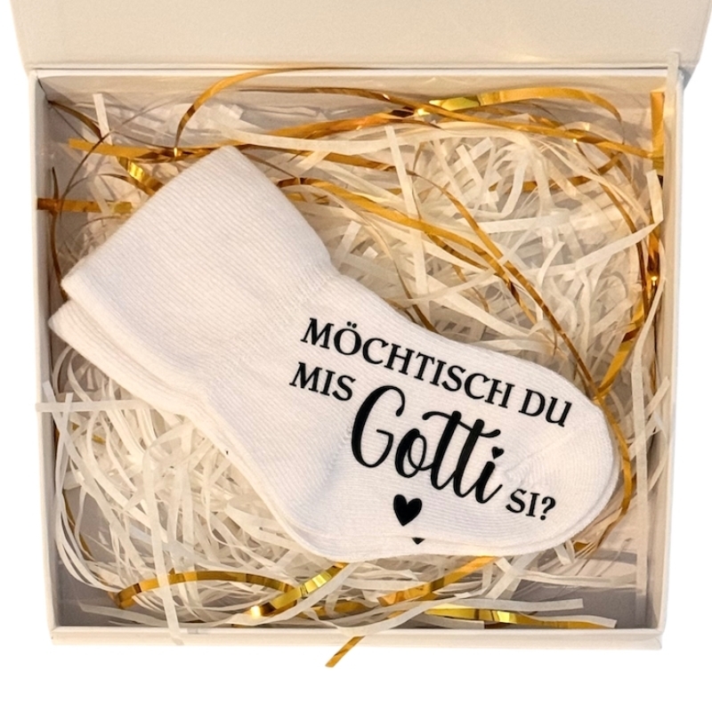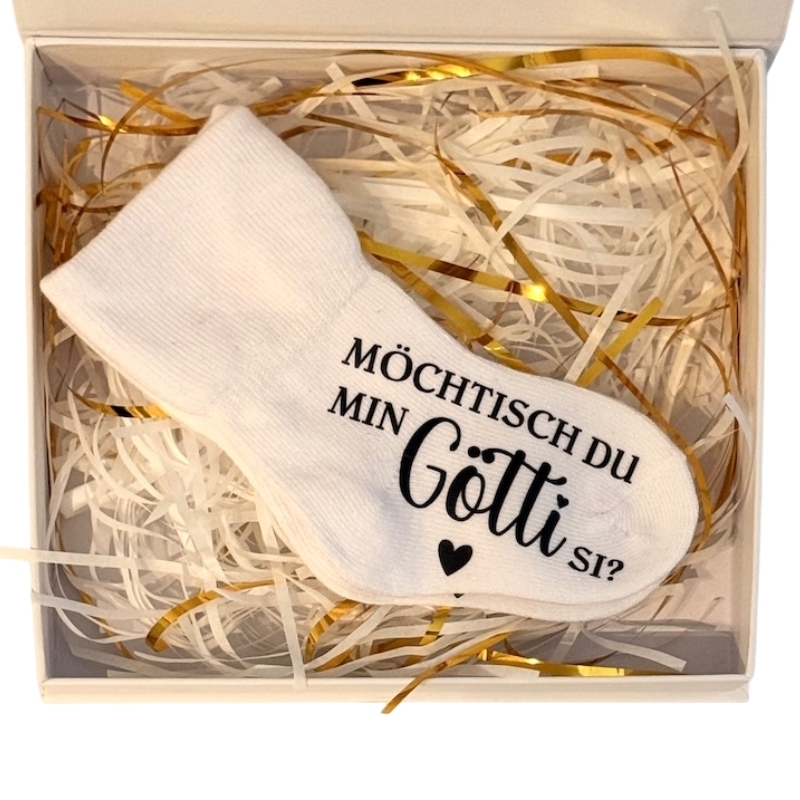Surprenez le futur parrain (ou marraine) avec une idée cadeau conçue avec amour : nos chaussettes pour bébé avec l'inscription « Möchtisch du min Götti si ? » ou « Möchtisch du mis Gotti si ? ».