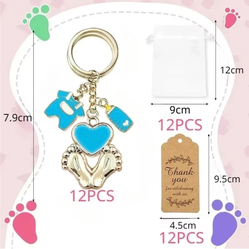Ce set de cadeaux d'invités contient tout ce dont vous avez besoin pour réaliser 12 cadeaux d'invités. Vous disposez de jolis sachets en organza que vous pouvez remplir d'amandes de mariage, de chocolat ou d'autres douceurs, puis décorer avec la petite carte jointe portant l'inscription « Thank you » et avec les adorables pieds de bébé, le body et le pendentif du biberon.