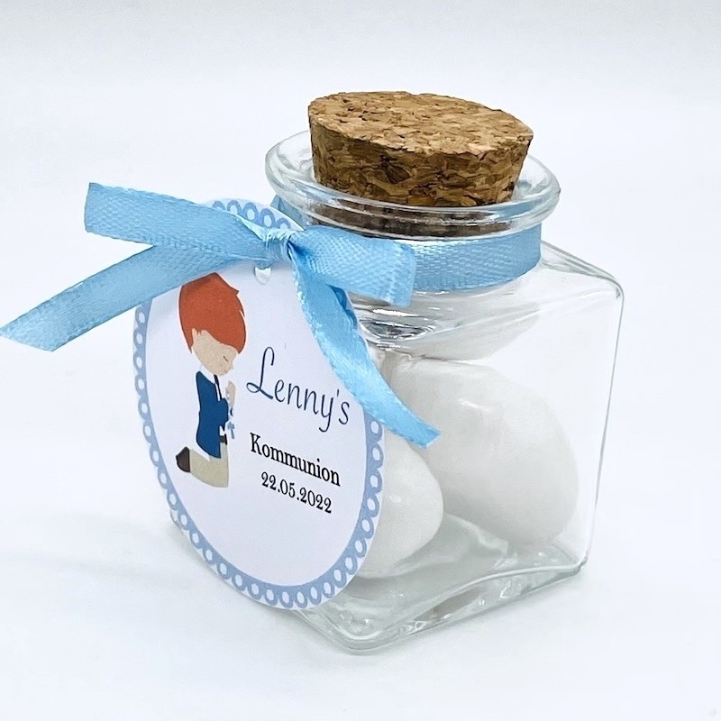 Idéal comme cadeau de communion élégant : petit pot carré en verre avec couvercle et noeud en satin.
