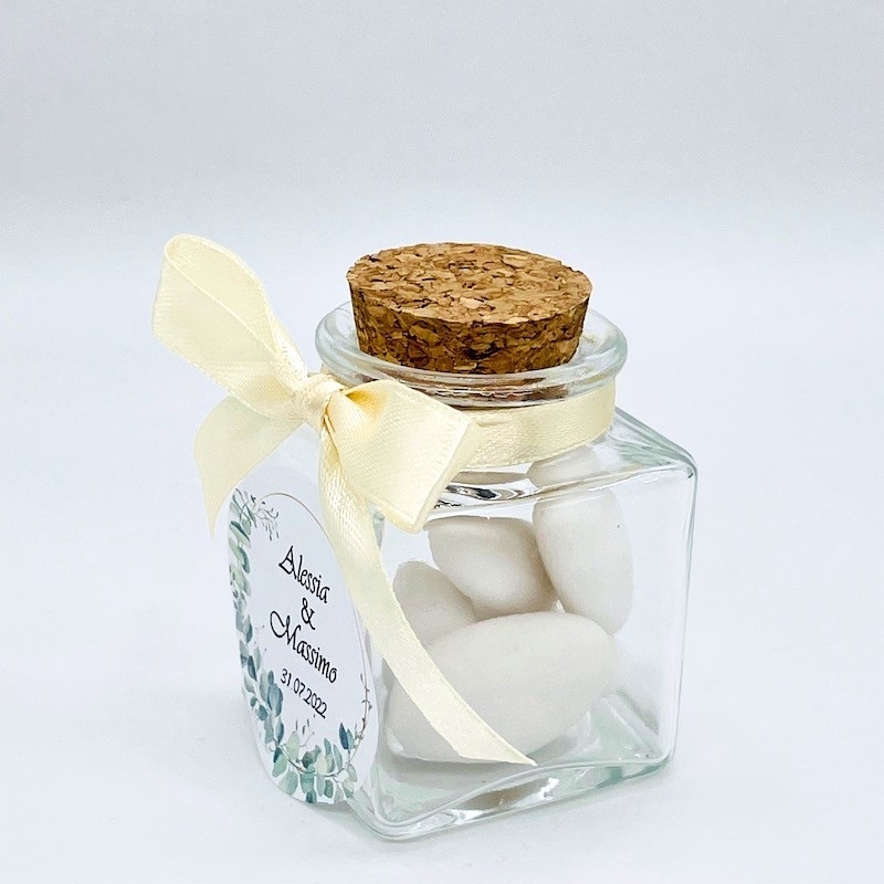 Contenu : Petit pot carré, boucle en satin, pendentif et 5 amandes de mariage. Les amandes de mariage sont livrées séparément afin qu'elles ne soient pas endommagées pendant le transport dans les pots carré en verre. Il suffit de remplir 5 amandes de mariage dans chaque pot carré en verre ed est fini.