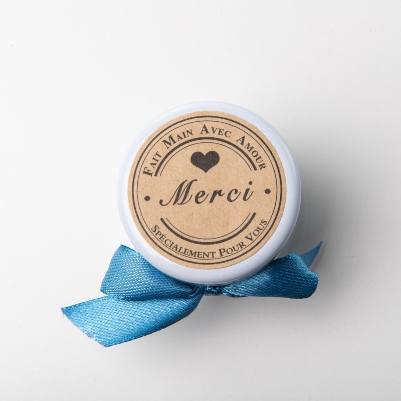 Sur le couvercle il y a un autocollant avec le mot "Merci". Le cadeau pour invités est livré avec cinq amandes de mariage.