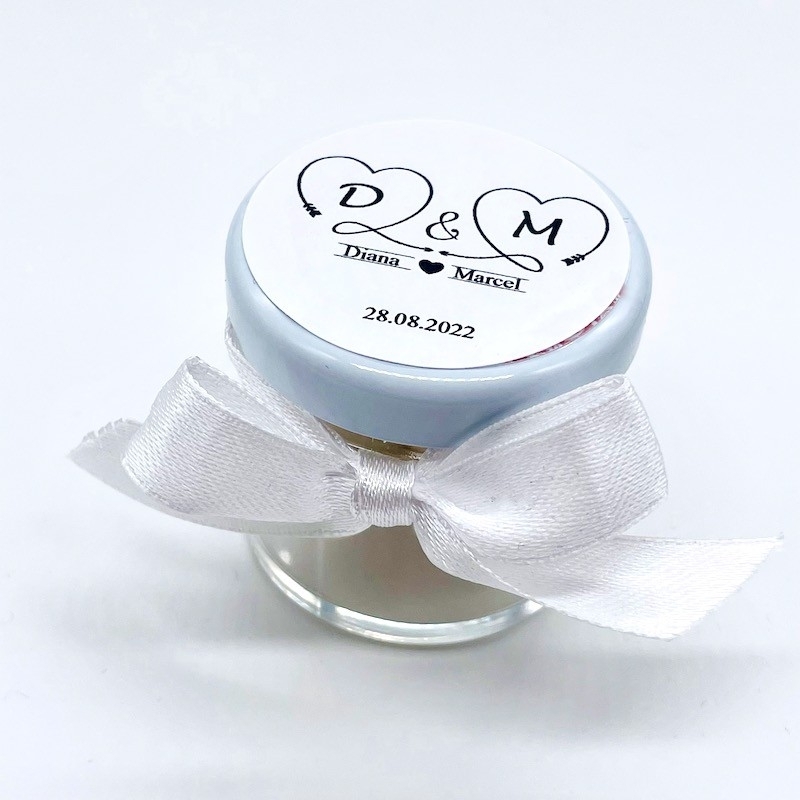 - Contenu : Mini pot, boucle en satin, autocollant & 5 amandes de mariage