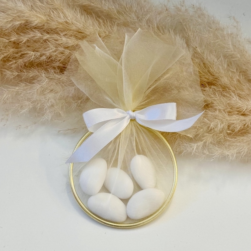Ce cadeau se compose de cinq amandes finement enrobées, emballées avec soin dans un petit sac en tulle délicat et ornées d'un nœud. L'anneau doré confère au cadeau une touche raffinée, parfaite pour les mariages, les baptêmes ou les occasions spéciales.