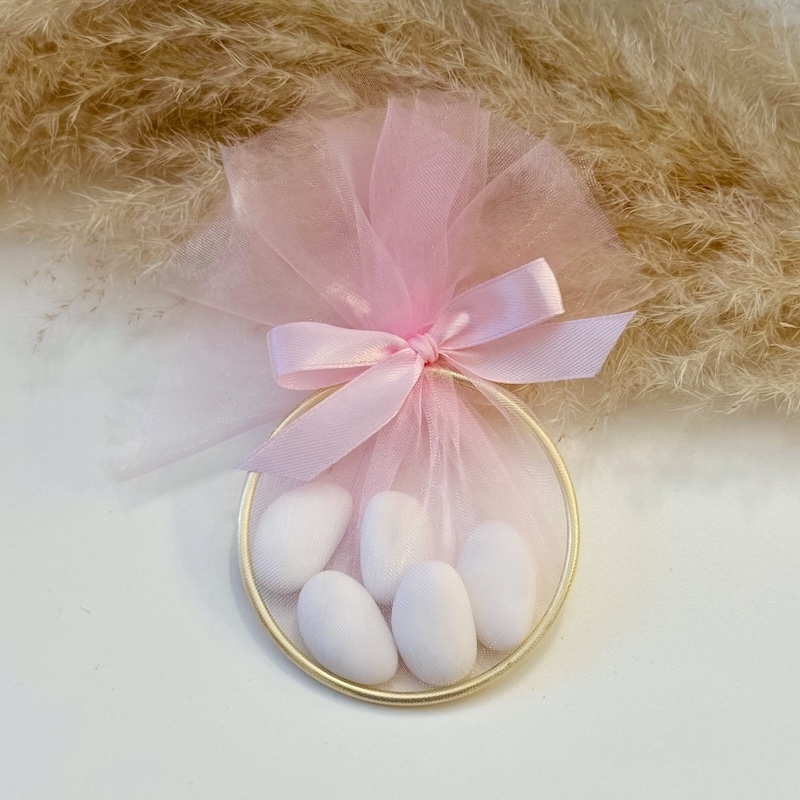 Ce cadeau se compose de cinq amandes finement enrobées, emballées avec soin dans un petit sac en tulle délicat et ornées d'un nœud. L'anneau doré confère au cadeau une touche raffinée, parfaite pour les mariages, les baptêmes ou les occasions spéciales.