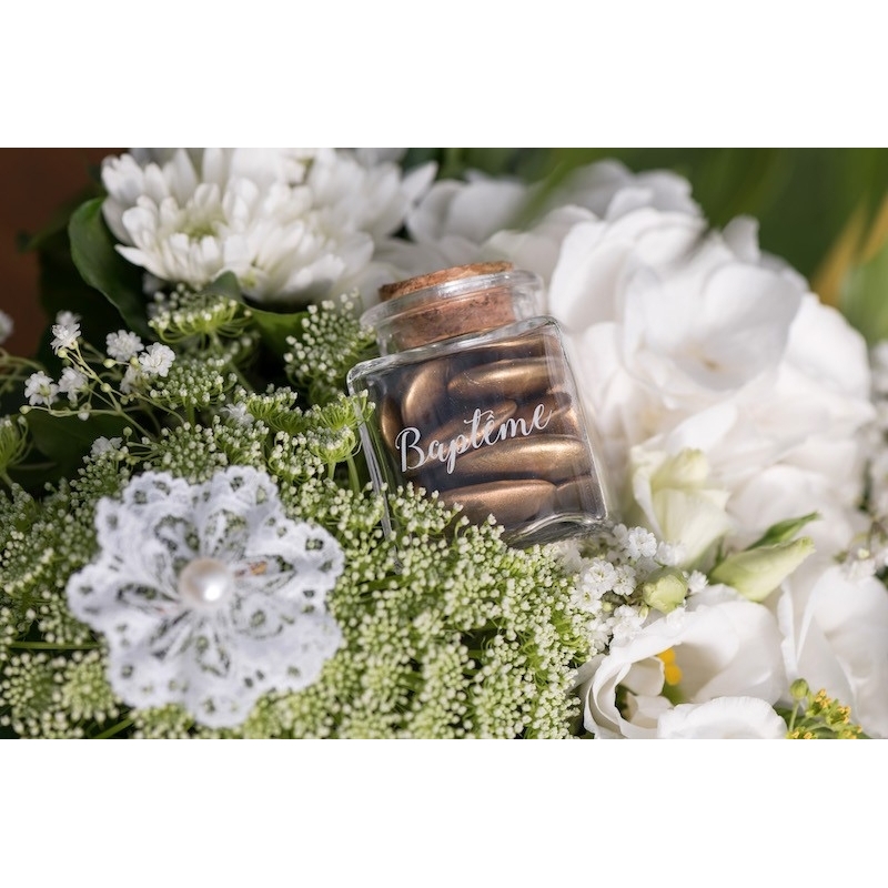 Offrir des dragées lors d’un baptême est une tradition. Alors, autant faire une belle décoration et placer ces dragées dans un contenant élégant. Ce ravissant pot avec son bouchon en liège sera un souvenir gourmand à ramener à la maison.