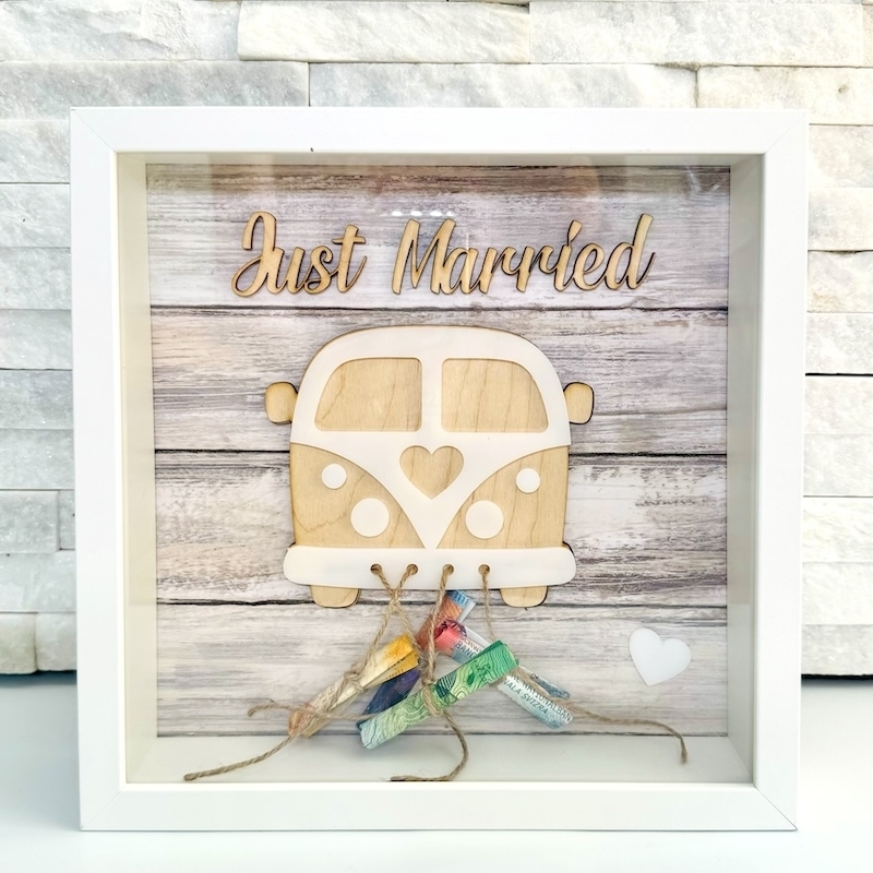 Cadre photo blanc avec couvercle en plastique. Les rubans préfabriqués sont déjà en place pour 4 boîtes - billets de banque. Le bus et l'inscription "Just Married" sont réalisés en bois et en acrylique.