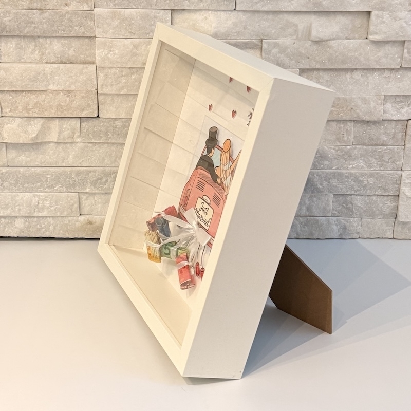 Cadre photo blanc avec couvercle en plastique. Les rubans préfabriqués sont déjà attachés pour 6 canettes - billets de banque. L'image est envoyée sans billets de banque.