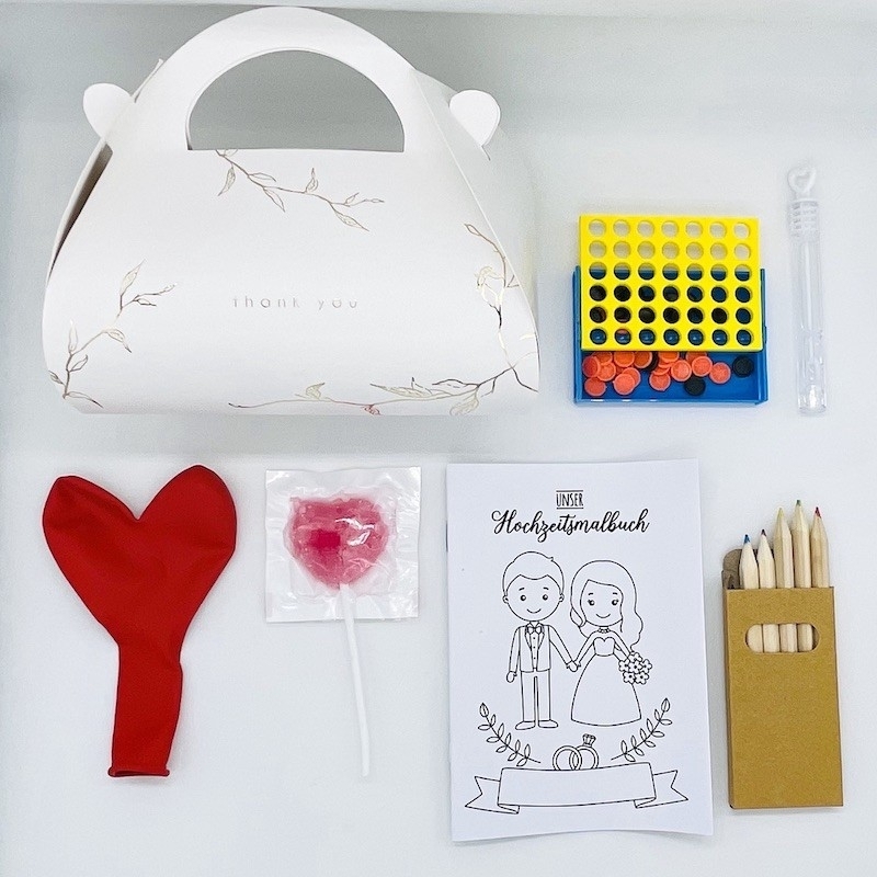La boîte de mariage pour enfants est pensée pour jouer et s'amuser à la table des enfants. Les enfants seront occupés pendant longtemps.