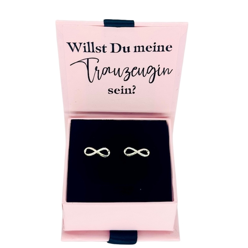 Ton cadeau est joliment emballé dans une élégante boîte cadeau avec la question "Willst du meine Trauzeugin sein?" en allemand.