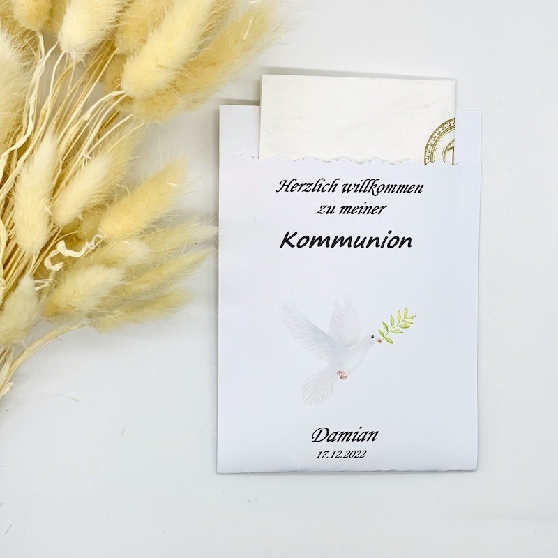 Pochette pour serviette décorée à la main pour un communion, avec inscription du nom et de la date. Une colombe en vol avec une branche. sont imprimés sur la serviette.