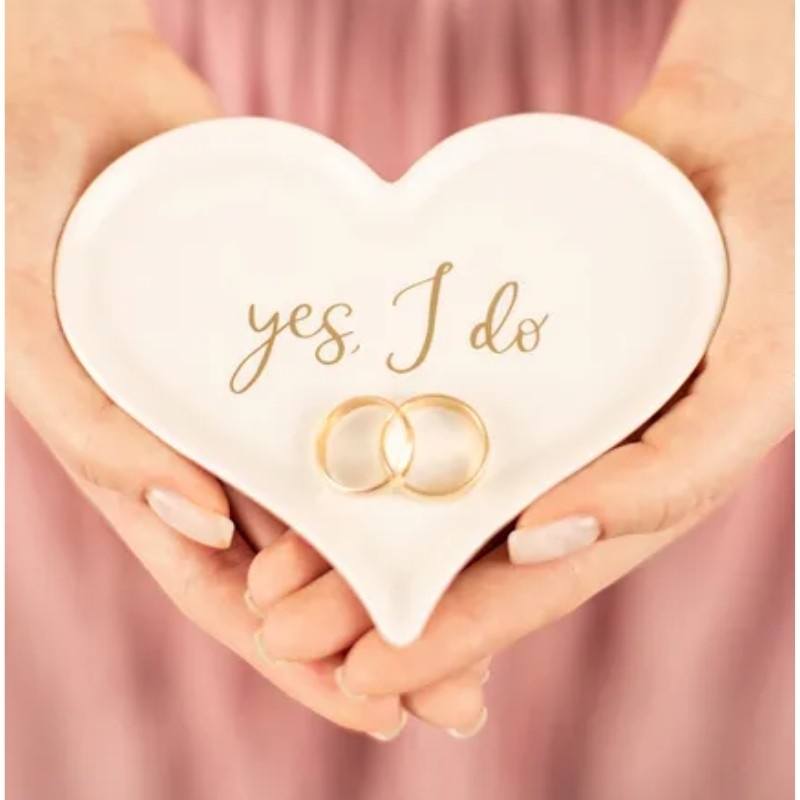 Tu cherches une alternative au coussin d'alliances classique ? Alors nous avons exactement ce qu'il te faut ! Avec notre coque de bague en porcelaine en forme de cœur avec l'impression "Yes, I do", tu peux présenter tes alliances avec style.