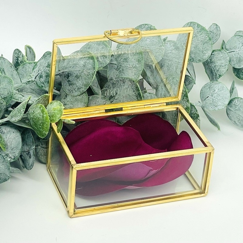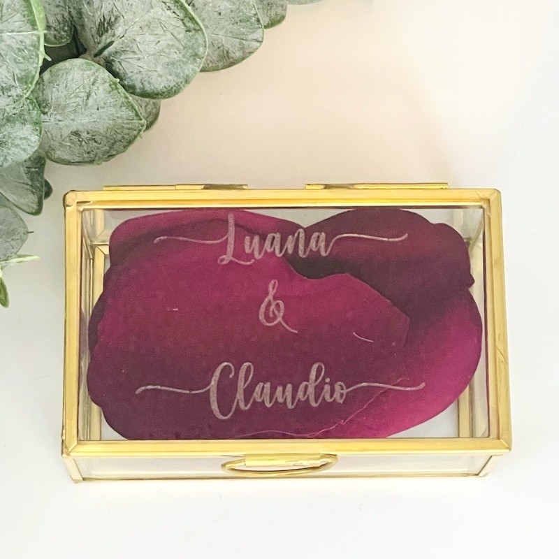 Boîte à alliance en verre et métal doré, personnalisée avec vos prénoms.