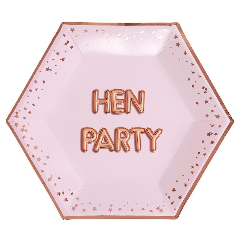 Ces assiettes en papier élégantes ont des étoiles en or rose sur le bord. Au milieu figure l'inscription HEN PARTY.