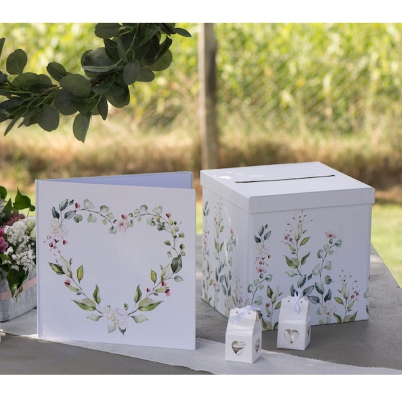 L'ensemble comprend une boîte aux lettres assortie, un élégant coussin à anneaux et un beau livre d'or. Les trois produits se distinguent par un design intemporel avec un joli cœur décoré de feuilles et de fleurs.