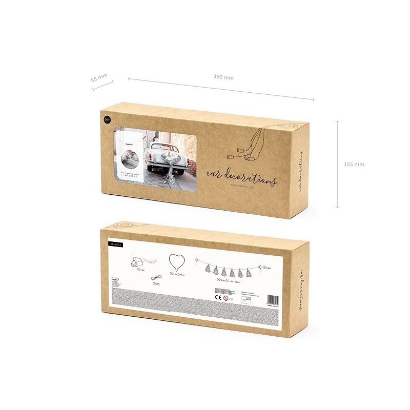 Décoration mariage voiture Coeur Argent , un ensemble original d’accessoires pour votre décoration voiture de cérémonie pour un thème blanc et argent très original!