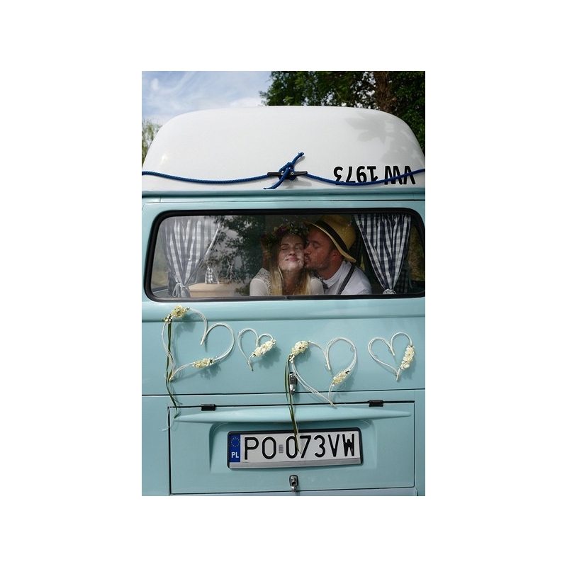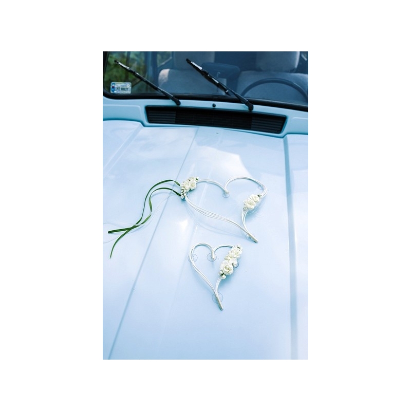 Ces coeurs serviront de centre de table, de décoration pour la voiture de la mariée, pour les fenêtres de votre salle. Ces sublimes compositions sont composées de fleurs magnifiques, de perles et de rubans en satin et se fixent par ventouses pour ne rien abimer.