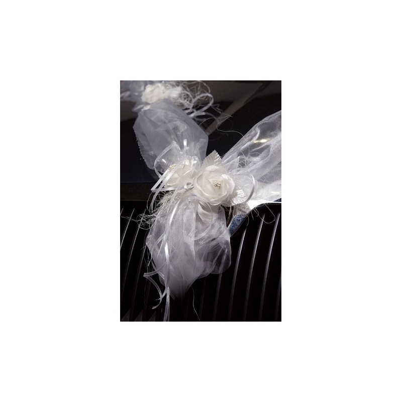 Deux superbes guirlandes voiture en organdi et roses satin avec rubans pour sublimer la voiture des mariés. Cette décoration voiture transformera la voiture de la mariée en carrosse de Cendrillon. Leur grande longueur leur permettront d'aller à toutes les voitures.