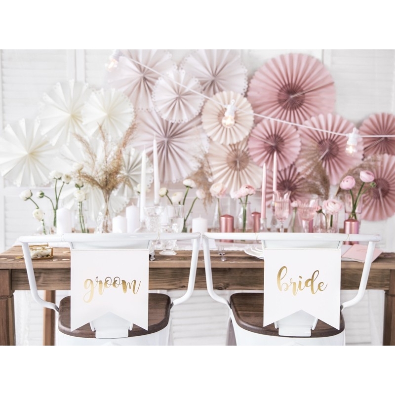 Les panneaux sont faits de carton blanc fin et sont chacun étiquetés avec "mariée" et "marié" en or métallique. Un mince fil doré est attaché à chaque panneau, de sorte que vous pouvez rapidement et facilement fixer les panneaux comme vous le souhaitez. Les panneaux peuvent être utilisés non seulement comme panneaux de chaise, mais aussi comme élément décoratif pour votre emplacement.