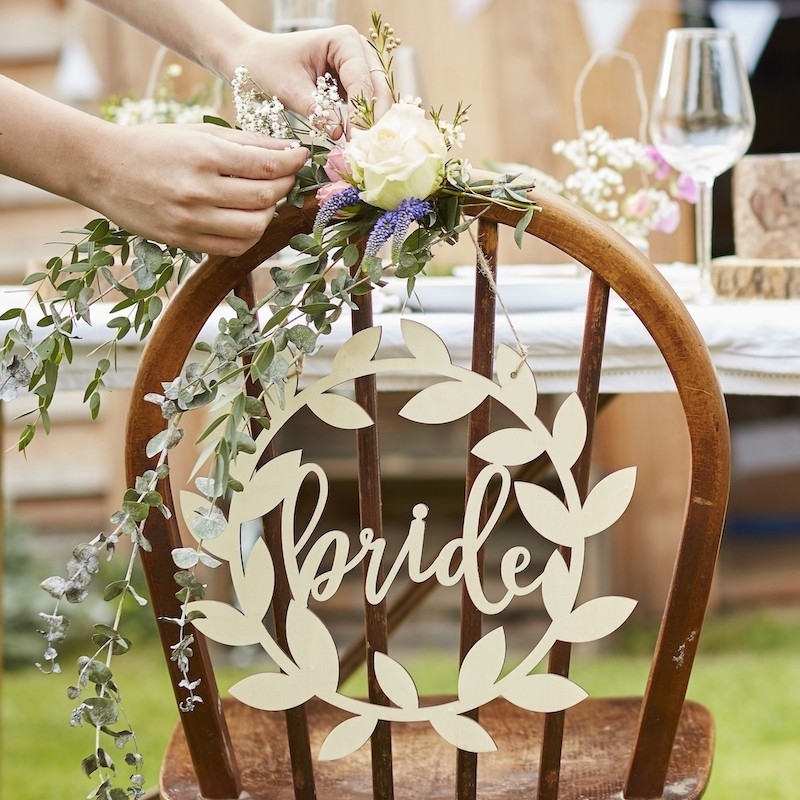 Vous célébrez un mariage de style rustique, vous aimez le boho ou le vintage ? Alors cette décoration de chaise en bois est un accessoire indispensable pour votre mariage ! Les mots "bride" et "groom" sont inscrits dans la couronne de feuilles romantique. Parfaites pour décorer vos places pour la cérémonie de mariage et pendant la fête, elles peuvent être utilisées pour décorer les murs ou l'entrée, mais aussi pour la séance photo.