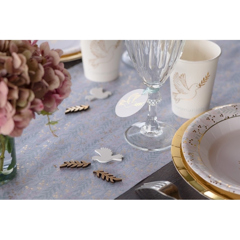 Ces 10 confettis de table Communion bois assortis vous aideront à concrétiser votre décoration de table autour d'une symbolique colombe et rameau d'olivier.