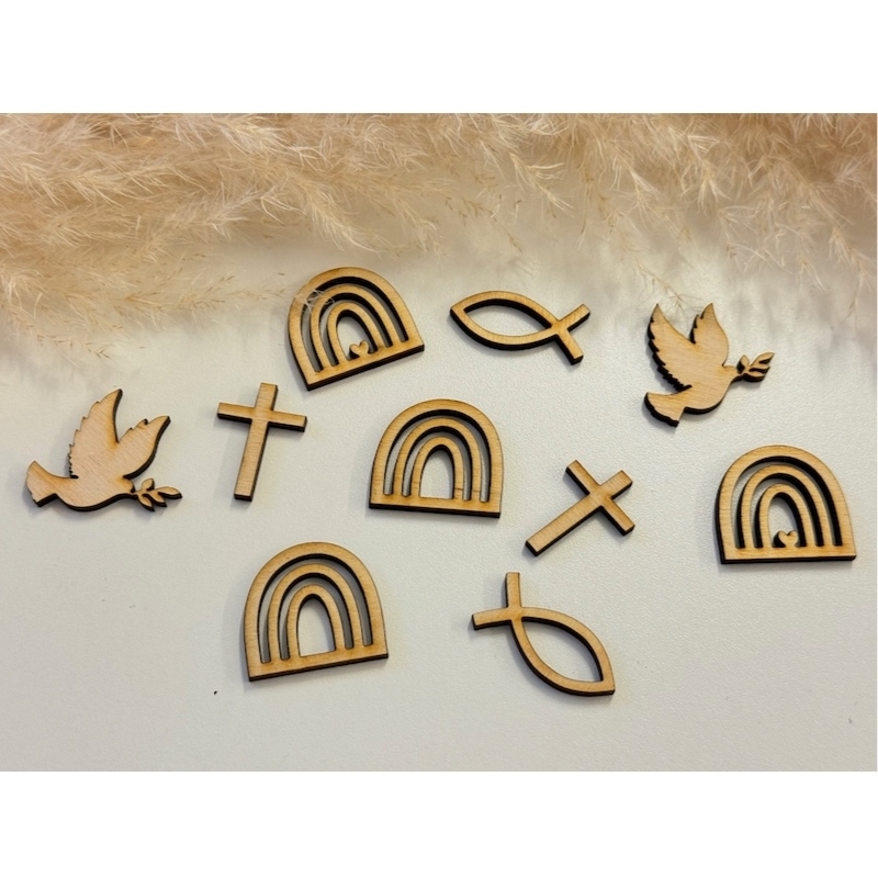 - Matériau : bois ( 2 x arc-en-ciel, 2 x arc-en-ciel avec cœur, 2 x colombe, 2 x croix et 2 x poisson)