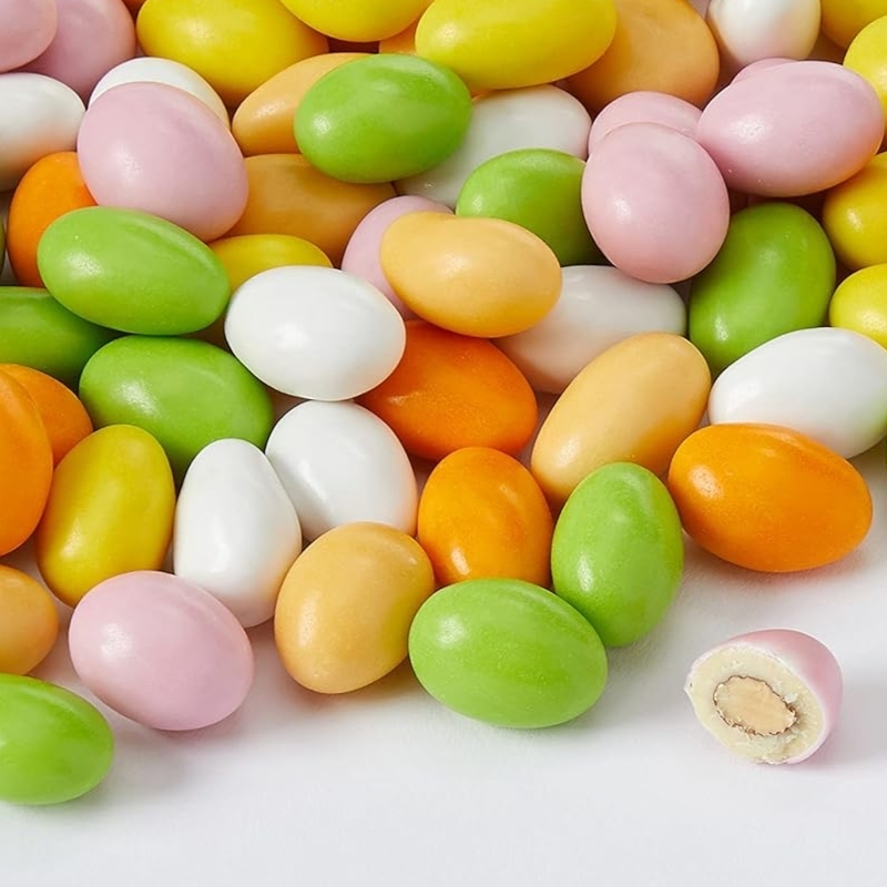 Ingrédients: Partie interne - chocolat blanc 56%, sucre, lait entier en poudre, beurre de cacao, émulsifiant : lécithine de SOY, arôme naturel de vanille, origine UE, arôme : ALMONDES torréfiées 17%. Ingrédients partie externe- sucre, amidon de riz, épaississant, gomme arabique, maltodextrine, arômes, Agent d'enrobage- cire de carnauba Colorants- E 120, E101, E133, E 160 a, E 171. Peut contenir des traces d'autres fruits à coque.