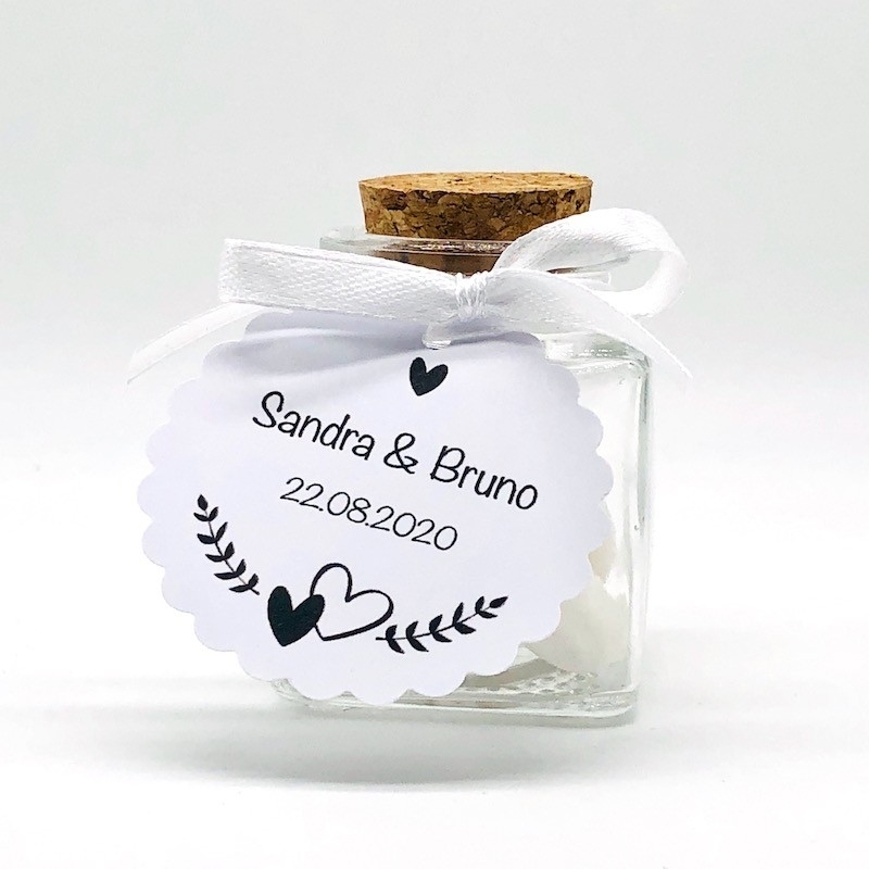 Pendentifs personnalisés pour cadeaux ou bulles de savon. Impression du nom des mariés et de la date du mariage.