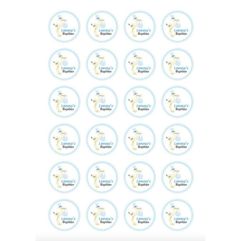 Avec les 24 autocollants ronds et personnalisés "Cigogne", donne un magnifique aspect aux cadeaux de baptême et surprends tes invités !
