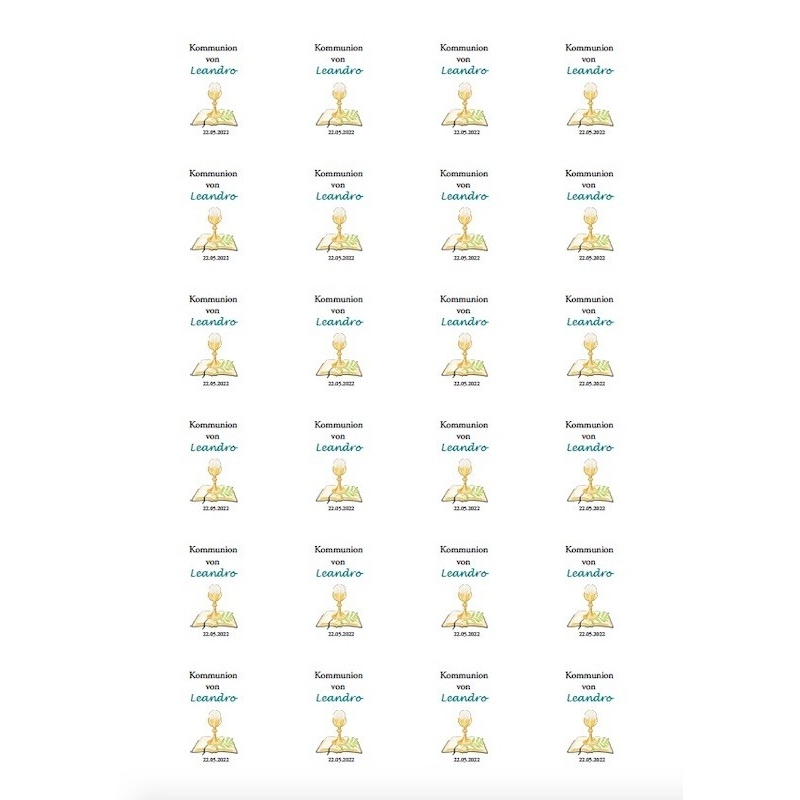 Avec les 24 autocollants ronds et personnalisés "Calice avec livre", donne un magnifique aspect aux cadeaux de communion et surprends tes invités !