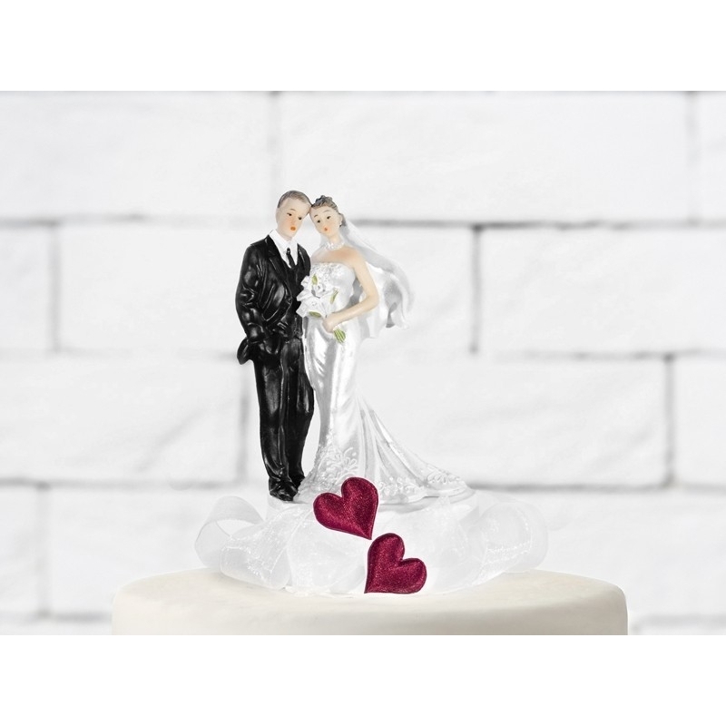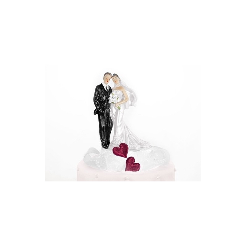 Magnifique personnage à gâteau avec socle recouvert d'organdi et 2 coeurs rouges. Ce personnage de qualité sublimera votre pièce montée et se transformera en centre de table mariage.