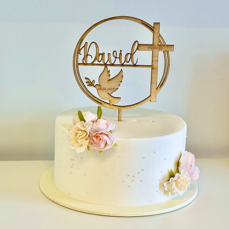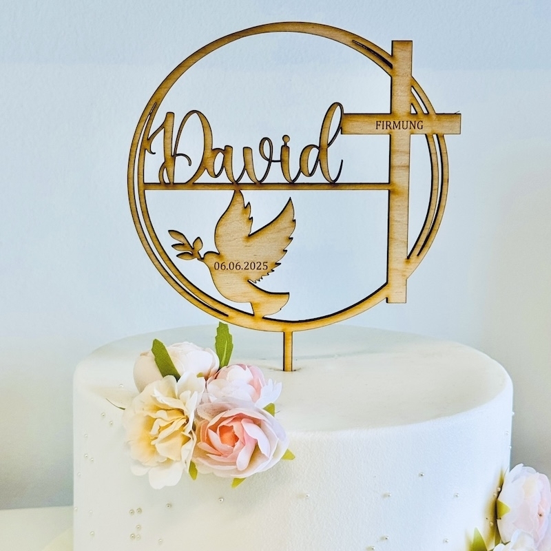 Cake Topper 'Croix & colombe' personnalisé - bois