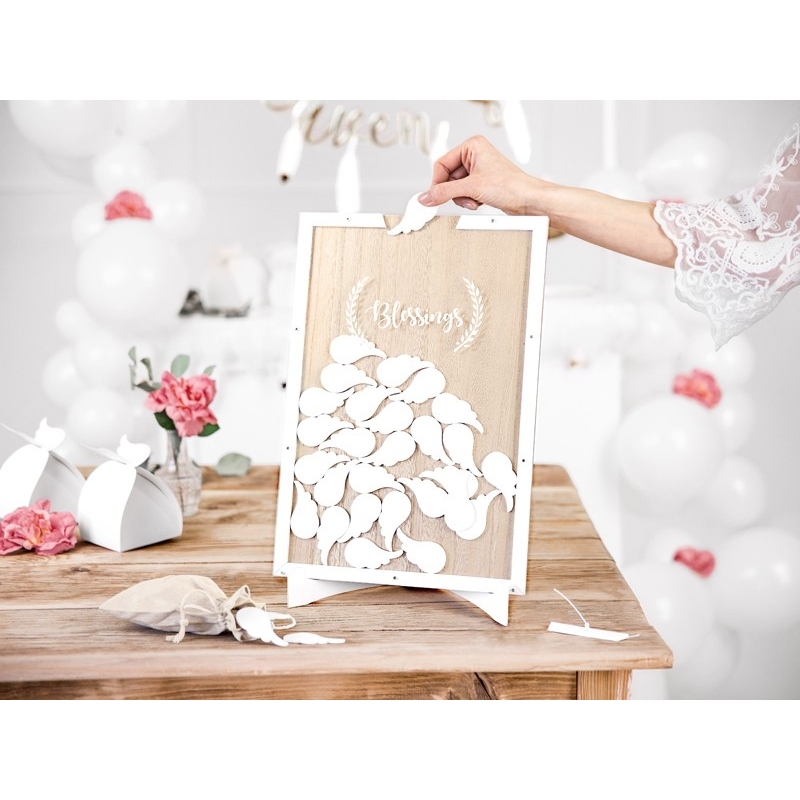 Choisissez l'originalité de ce livre d'or en bois avec l'inscription "Blessing" qui veux dire bénédiction en français avec ses ailes d'ange.