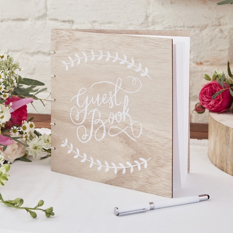 Ce livre d'or en bois clair, décoré d'un joli motif floral et des mots "Guest Book" écrits en blanc, est un souvenir indispensable de cette magnifique journée. Le livre d'or idéal pour un mariage rustique chic, à la campagne et en pleine nature !