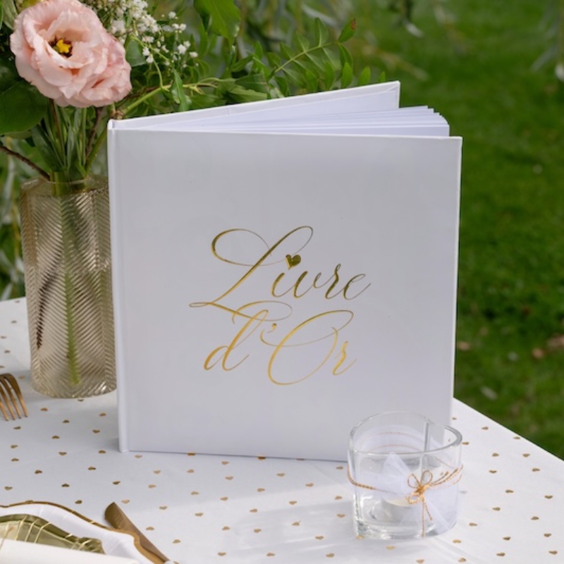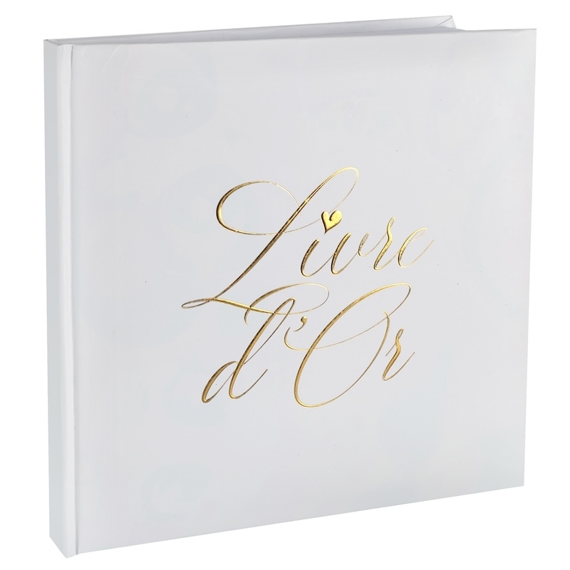 Cet élégant album de mariage « Livre d'Or » est le choix idéal pour immortaliser des moments inoubliables et des souvenirs précieux. Ce livre d'or raffiné séduit par sa couverture blanche élégante ornée d'un gaufrage doré de grande qualité au design romantique. Le petit cœur qui apporte une touche délicate et festive à l'album constitue un détail particulier.