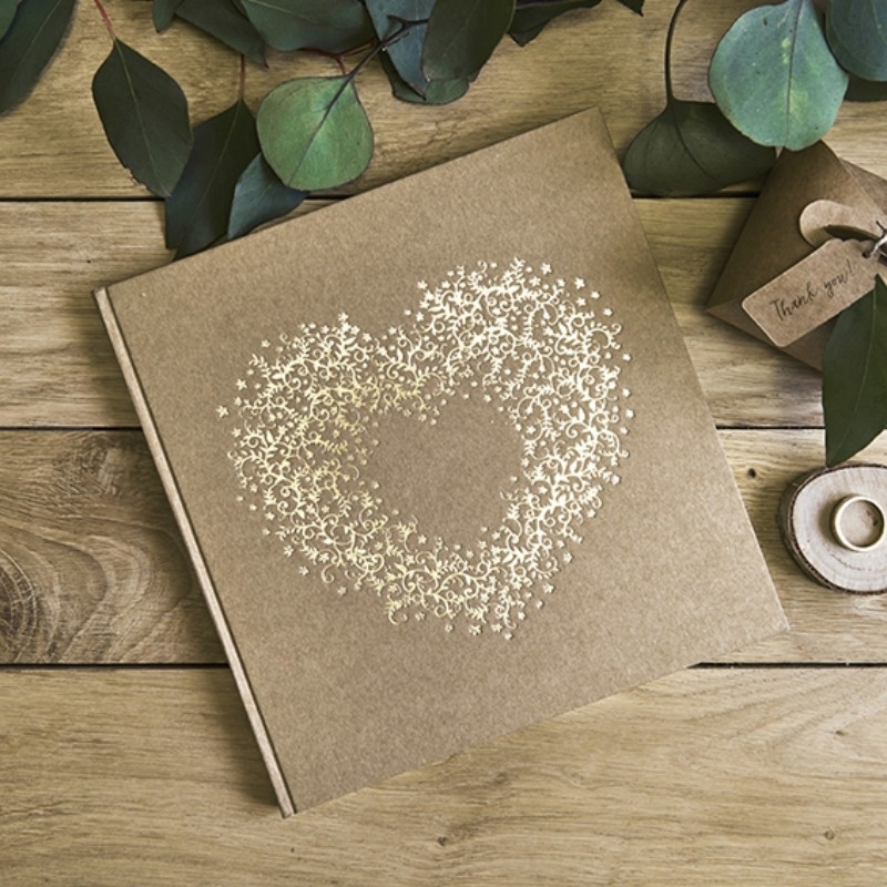 Livre d'or de couleur crème avec un motif de cœurs dorés. C'est un élément indispensable de tout mariage qui vous permettra de conserver à jamais les souvenirs de cette merveilleuse journée.
