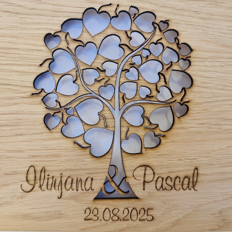 Nous gravons pour vous le design, le remplaçons par les noms et dates souhaités pour votre livre d'or de mariage individuel. Notre laser grave avec une grande précision votre contenu dans la surface du bois. C'est pour cette raison que la couleur foncée est obtenue avec un superbe contraste.