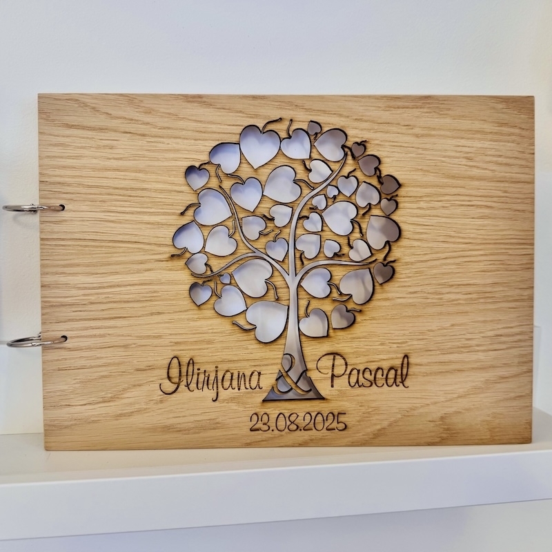 Le bois est un produit naturel et peut donc présenter des différences de veinure et de couleur. La découpe au laser peut entraîner des traces de brûlure (assombrissement du bois). Cela donne aux produits leur caractère typique. Ainsi, chaque livre d'or est unique.