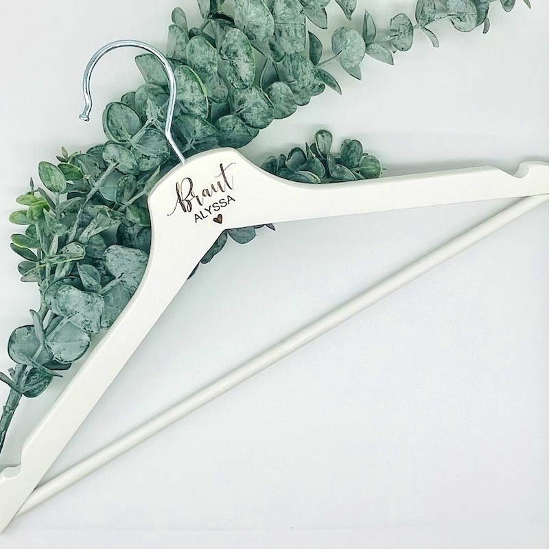 Fabriqués en bois massif et gravés avec précision grâce à la technologie laser, ces cintres sont un cadeau bien pensé pour la future mariée.