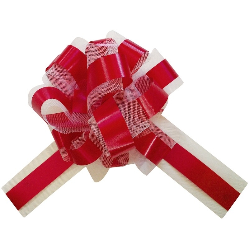 Un grand noeud en tulle et polypropylène blanc très simple d'utilisation, il suffit de tirer sur les petits rubans et le noeud se met automatiquement en forme.