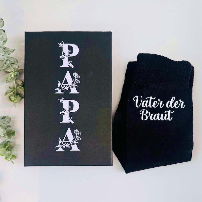 Les chaussettes sont imprimées sur l'extérieur avec le texte : "Vater der Braut".