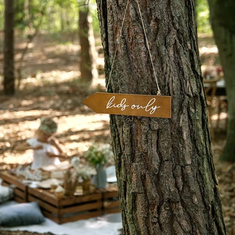 Voici une manière simple et originale pour orienter vos invités vers le lieu de cérémonie. Cette pancarte en bois est de forme flèche. Elle porte l’inscription blanche en anglais « kids only ». C’est un panneau directionnel à suspendre. D’ailleurs, il vous est livré avec une cordelette en matière naturelle.