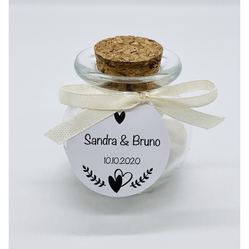 Contenu : Pot en verre, ruban et pendentif personnalisé. Les amandes de mariage sont livrées séparément afin qu'elles ne soient pas endommagées pendant le transport dans les pots en verre. Il suffit de remplir 5 amandes de mariage dans chaque pot en verre ed est fini.