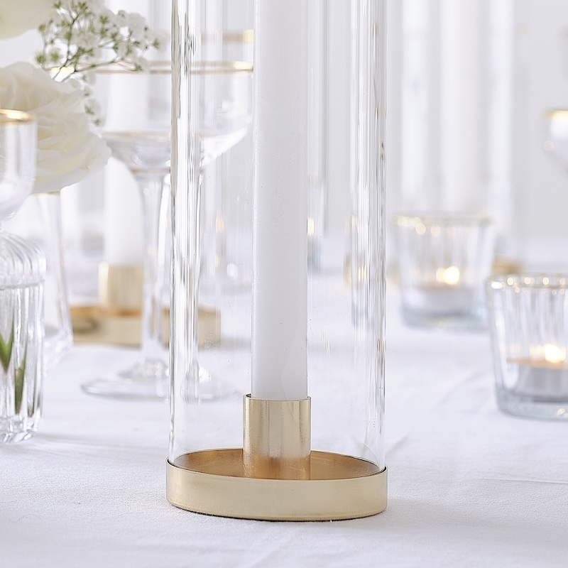 - Contenu : 1 x bougeoir en verre avec socle en métal doré avec une bougie blanche.