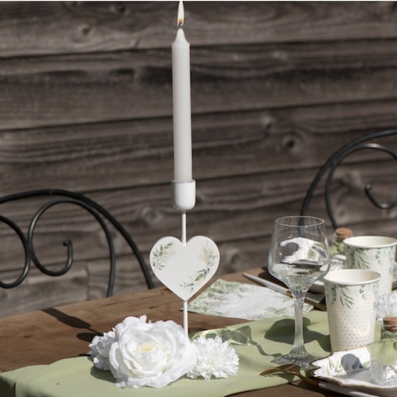 Le bougeoir est délicatement décoré de motifs de feuillage et ajoute une touche de fraîcheur et de romantisme à votre décoration. Idéal pour les mariages en plein air, les mariages champêtres ou tout événement où une touche naturelle est souhaitée.