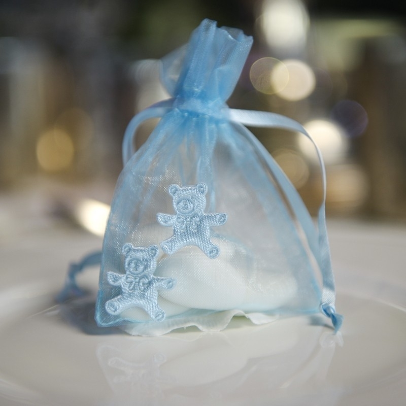 Sachet organza décoré avec 2 petits ours. Si vous attachez une petite carte avec un nom, vous pouvez utiliser ce sachet comme marque place.